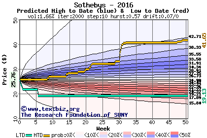 The high to date and low to date prices of the stock plotted against a random walk model for 2016 (what's this?).
