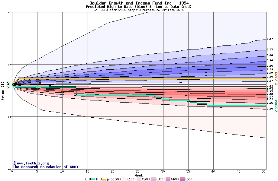 The high to date and low to date prices of the stock plotted against a random walk model for 1994 (what's this?).