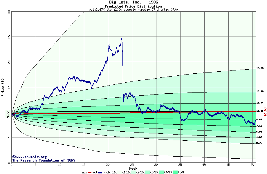 The following graph plots the year-to-date performance of the stock for 1986 compared to the probability calculated by a random walk model.