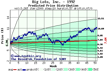 The following graph plots the year-to-date performance of the stock for 1992 compared to the probability calculated by a random walk model.