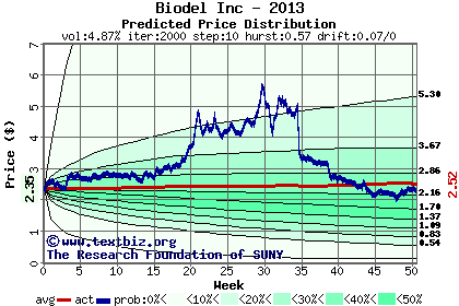The high to date and low to date prices of the stock plotted against a random walk model for 2013 (what's this?).