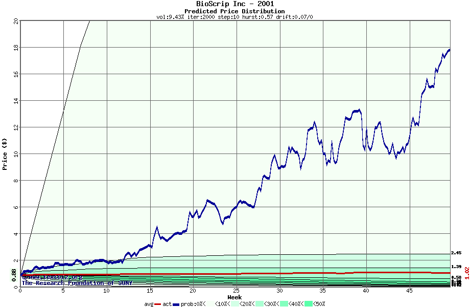 The high to date and low to date prices of the stock plotted against a random walk model for 2001 (what's this?).