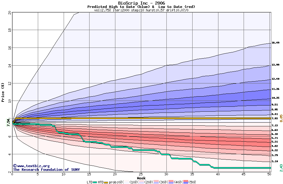 The high to date and low to date prices of the stock plotted against a random walk model for 2006 (what's this?).