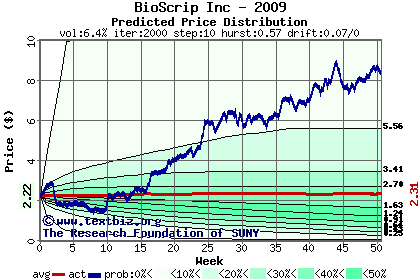 The high to date and low to date prices of the stock plotted against a random walk model for 2009 (what's this?).
