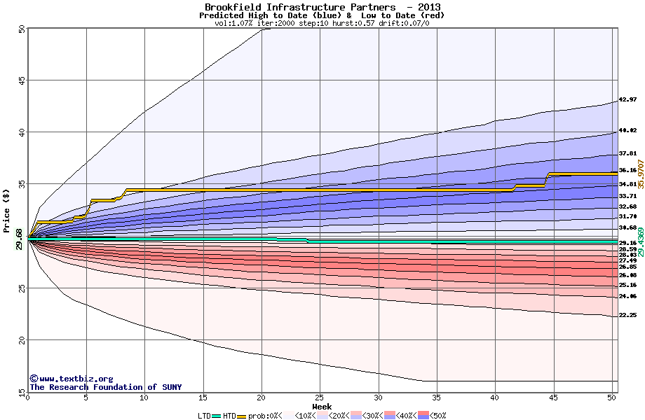 The high to date and low to date prices of the stock plotted against a random walk model for 2013 (what's this?).