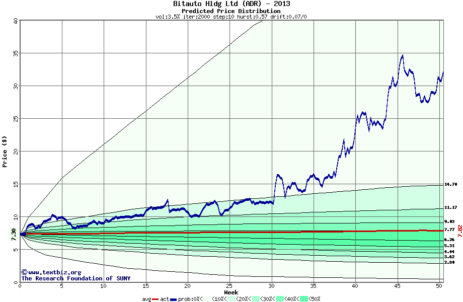 The following graph plots the year-to-date performance of the stock for 2013 compared to the probability calculated by a random walk model.