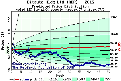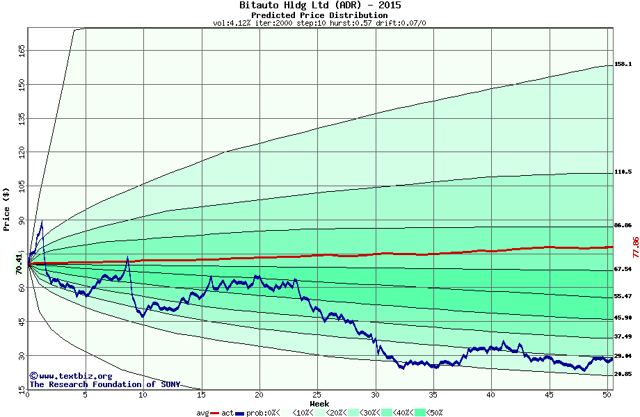 The high to date and low to date prices of the stock plotted against a random walk model for 2015 (what's this?).