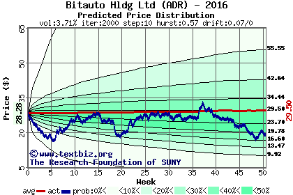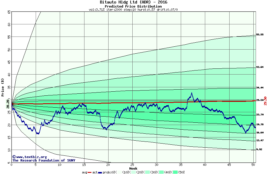The high to date and low to date prices of the stock plotted against a random walk model for 2016 (what's this?).
