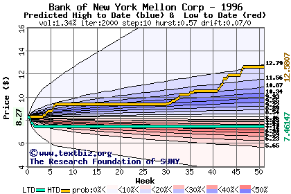 The high to date and low to date prices of the stock plotted against a random walk model for 1996 (what's this?).