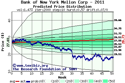 The high to date and low to date prices of the stock plotted against a random walk model for 2011 (what's this?).