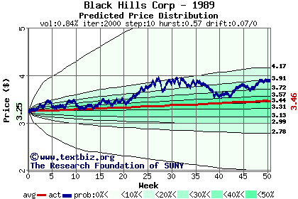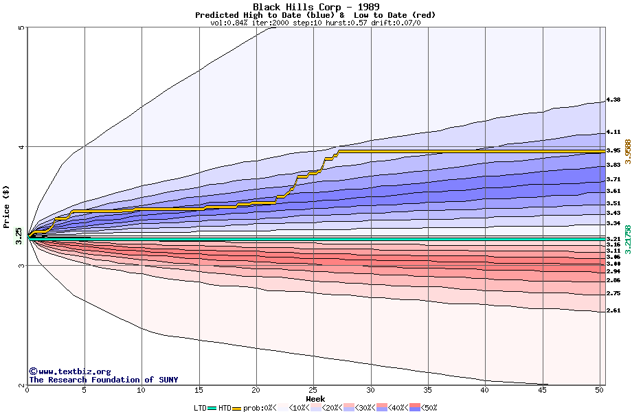 The high to date and low to date prices of the stock plotted against a random walk model for 1989 (what's this?).