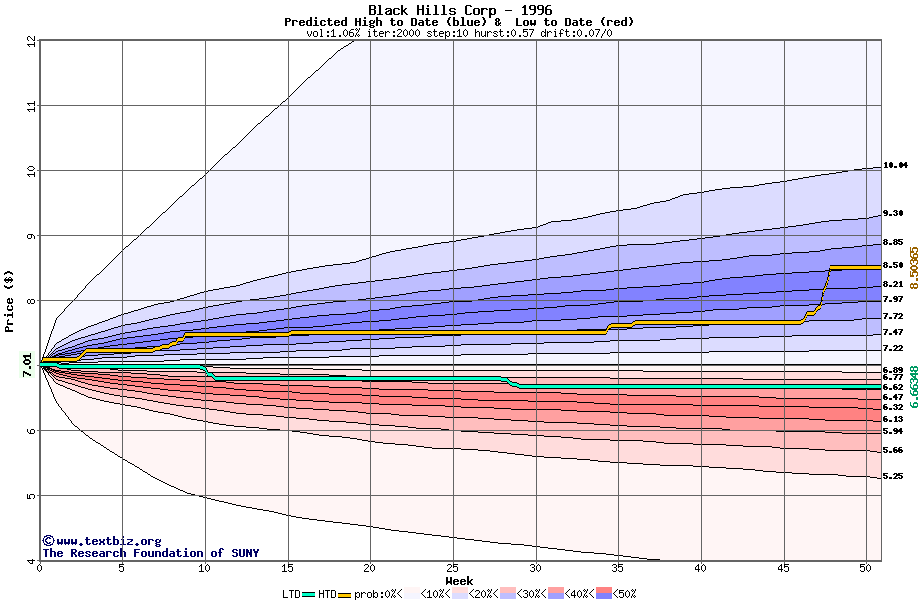 The high to date and low to date prices of the stock plotted against a random walk model for 1996 (what's this?).