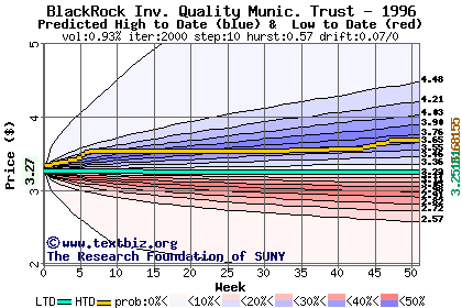 The high to date and low to date prices of the stock plotted against a random walk model for 1996 (what's this?).