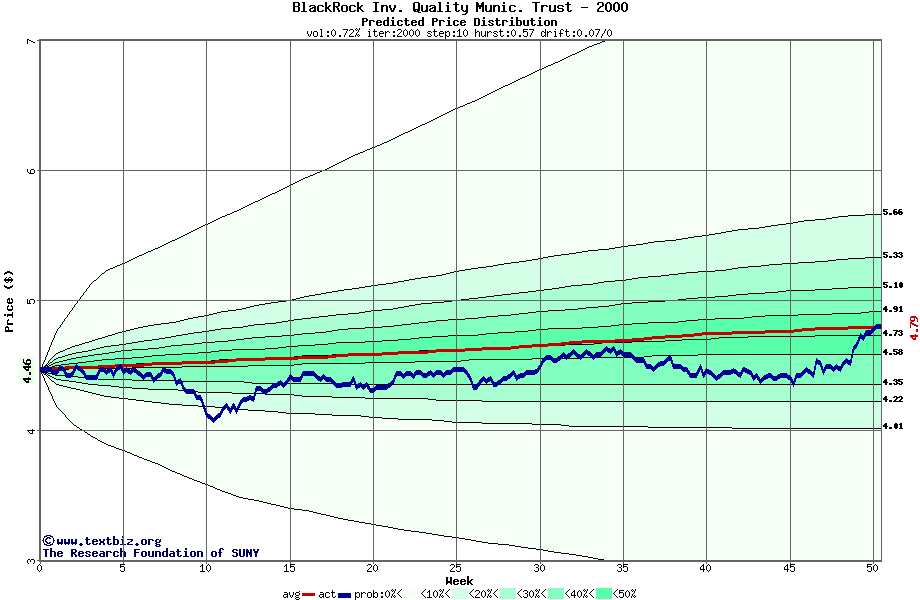 The high to date and low to date prices of the stock plotted against a random walk model for 2000 (what's this?).
