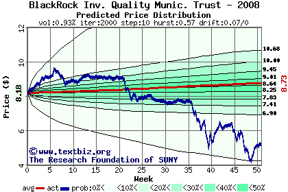 The high to date and low to date prices of the stock plotted against a random walk model for 2008 (what's this?).