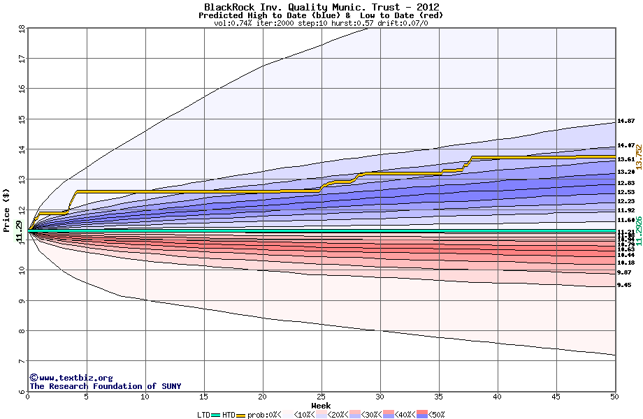The high to date and low to date prices of the stock plotted against a random walk model for 2012 (what's this?).
