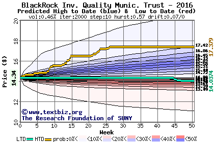 The high to date and low to date prices of the stock plotted against a random walk model for 2016 (what's this?).