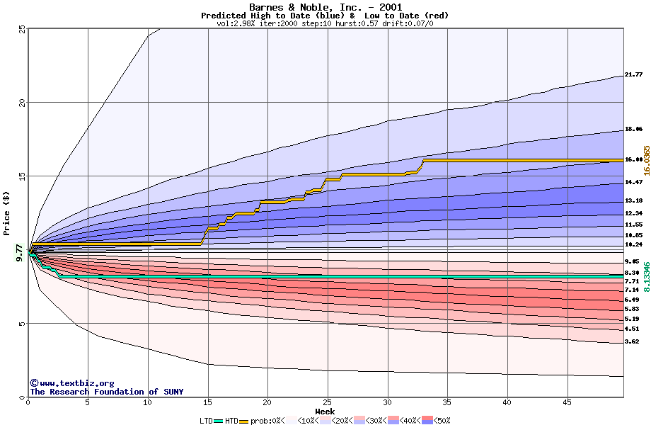 The high to date and low to date prices of the stock plotted against a random walk model for 2001 (what's this?).
