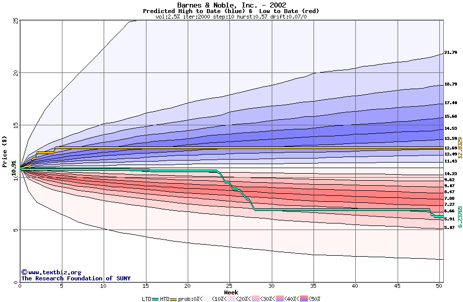The high to date and low to date prices of the stock plotted against a random walk model for 2002 (what's this?).