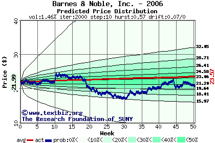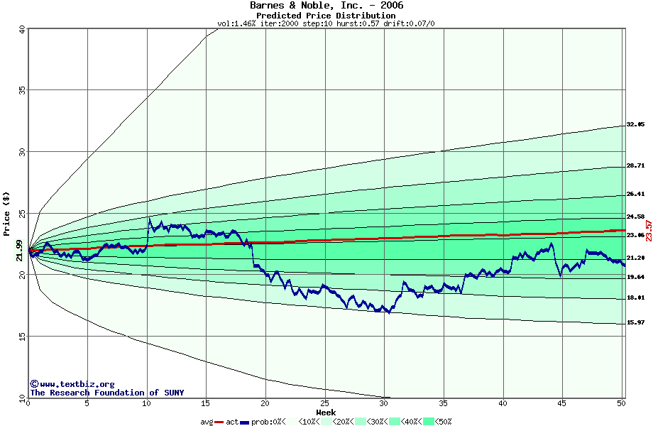 The following graph plots the year-to-date performance of the stock for 2006 compared to the probability calculated by a random walk model.