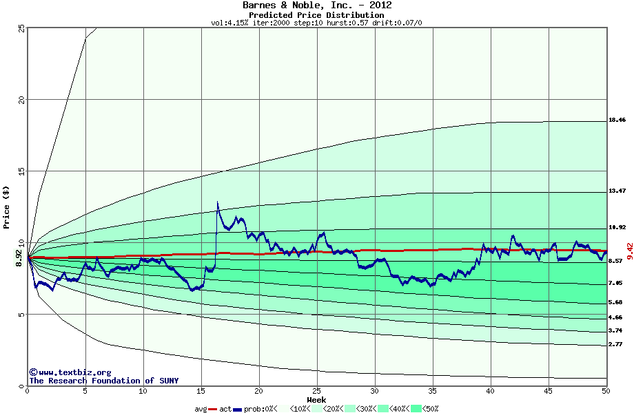 The following graph plots the year-to-date performance of the stock for 2012 compared to the probability calculated by a random walk model.
