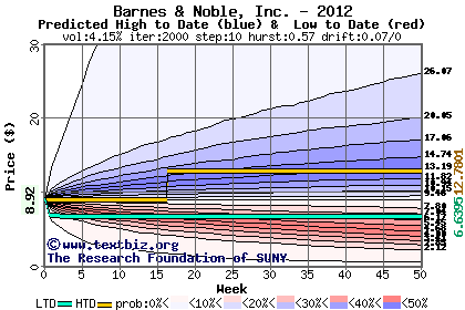 The high to date and low to date prices of the stock plotted against a random walk model for 2012 (what's this?).