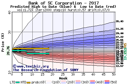 The high to date and low to date prices of the stock plotted against a random walk model for 2017 (what's this?).