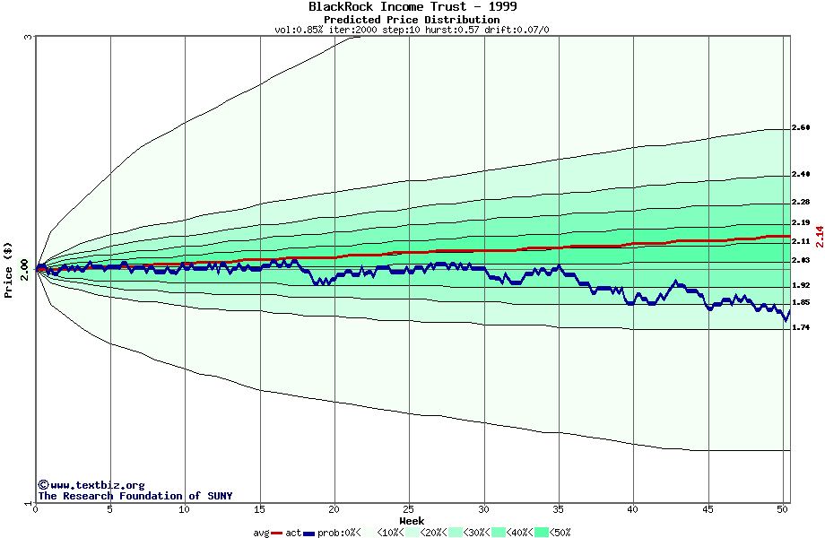 The high to date and low to date prices of the stock plotted against a random walk model for 1999 (what's this?).