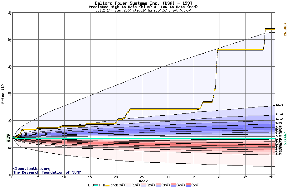 The high to date and low to date prices of the stock plotted against a random walk model for 1997 (what's this?).