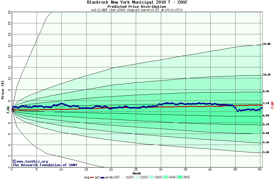 The high to date and low to date prices of the stock plotted against a random walk model for 2002 (what's this?).