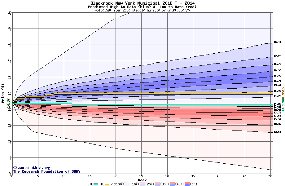 The high to date and low to date prices of the stock plotted against a random walk model for 2014 (what's this?).