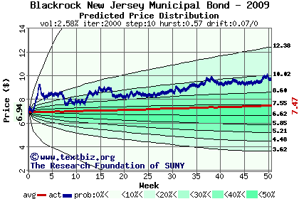 The high to date and low to date prices of the stock plotted against a random walk model for 2009 (what's this?).