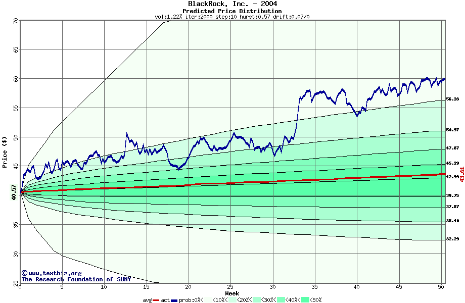 The following graph plots the year-to-date performance of the stock for 2004 compared to the probability calculated by a random walk model.