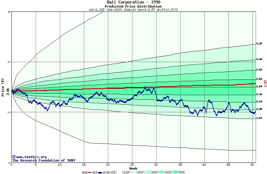 The following graph plots the year-to-date performance of the stock for 1990 compared to the probability calculated by a random walk model.