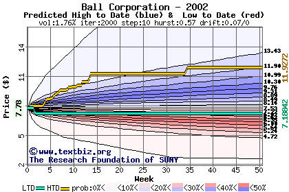 The high to date and low to date prices of the stock plotted against a random walk model for 2002 (what's this?).