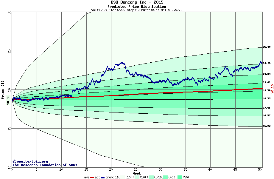 The following graph plots the year-to-date performance of the stock for 2015 compared to the probability calculated by a random walk model.