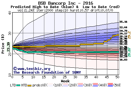 The high to date and low to date prices of the stock plotted against a random walk model for 2016 (what's this?).