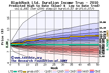 The high to date and low to date prices of the stock plotted against a random walk model for 2010 (what's this?).