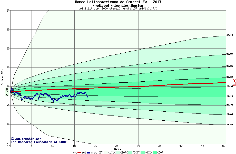 The high to date and low to date prices of the stock plotted against a random walk model for 2017 (what's this?).