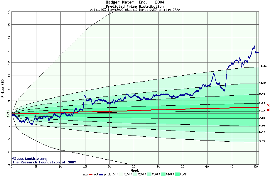The following graph plots the year-to-date performance of the stock for 2004 compared to the probability calculated by a random walk model.