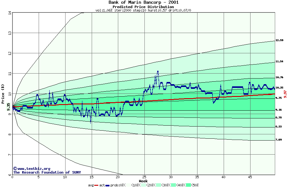 The following graph plots the year-to-date performance of the stock for 2001 compared to the probability calculated by a random walk model.