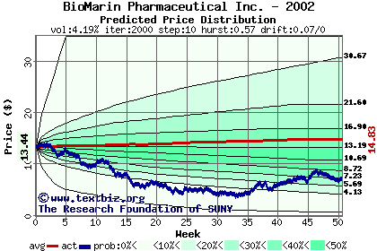 The high to date and low to date prices of the stock plotted against a random walk model for 2002 (what's this?).
