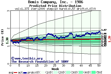 The high to date and low to date prices of the stock plotted against a random walk model for 1986 (what's this?).