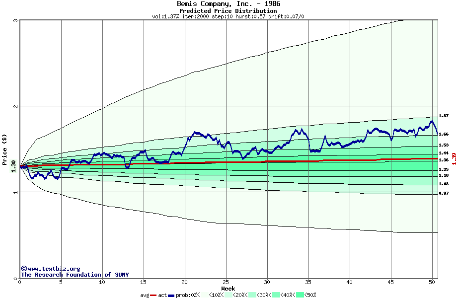The following graph plots the year-to-date performance of the stock for 1986 compared to the probability calculated by a random walk model.