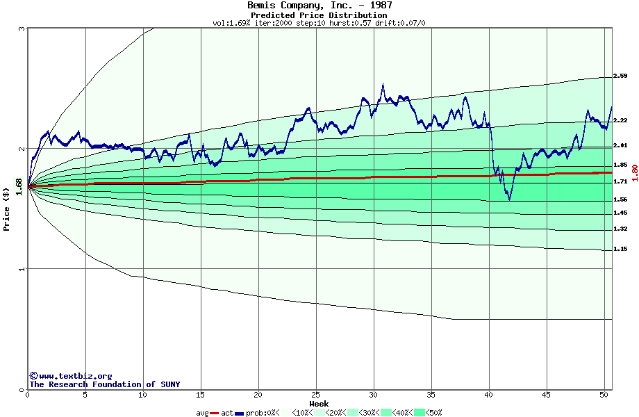 The high to date and low to date prices of the stock plotted against a random walk model for 1987 (what's this?).
