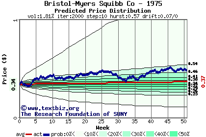The high to date and low to date prices of the stock plotted against a random walk model for 1975 (what's this?).