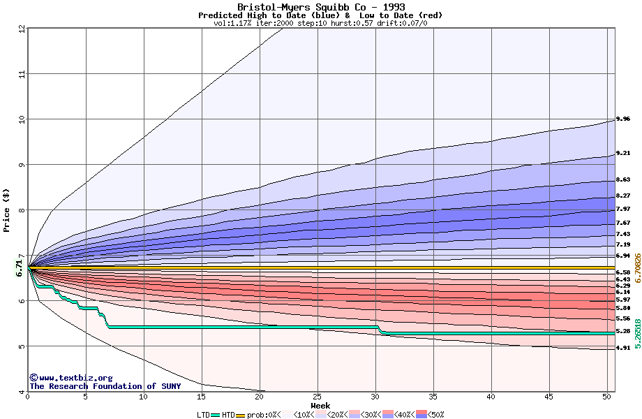 The high to date and low to date prices of the stock plotted against a random walk model for 1993 (what's this?).