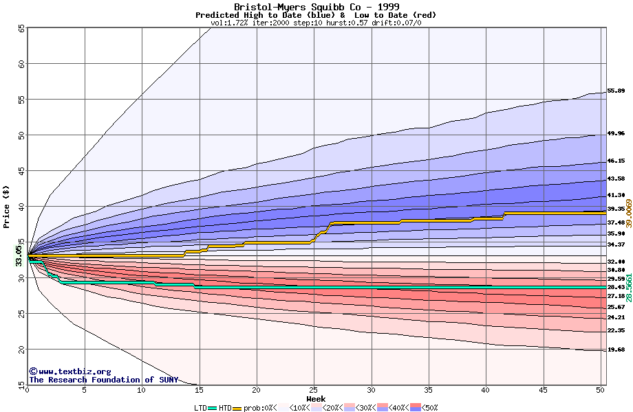 The high to date and low to date prices of the stock plotted against a random walk model for 1999 (what's this?).