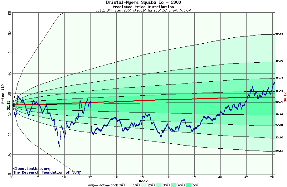 The following graph plots the year-to-date performance of the stock for 2000 compared to the probability calculated by a random walk model.