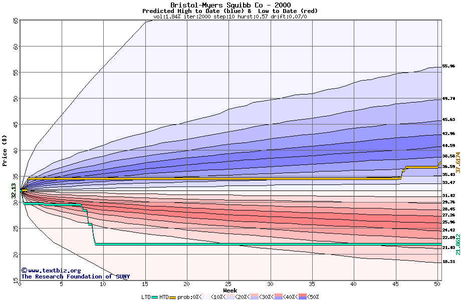 The high to date and low to date prices of the stock plotted against a random walk model for 2000 (what's this?).